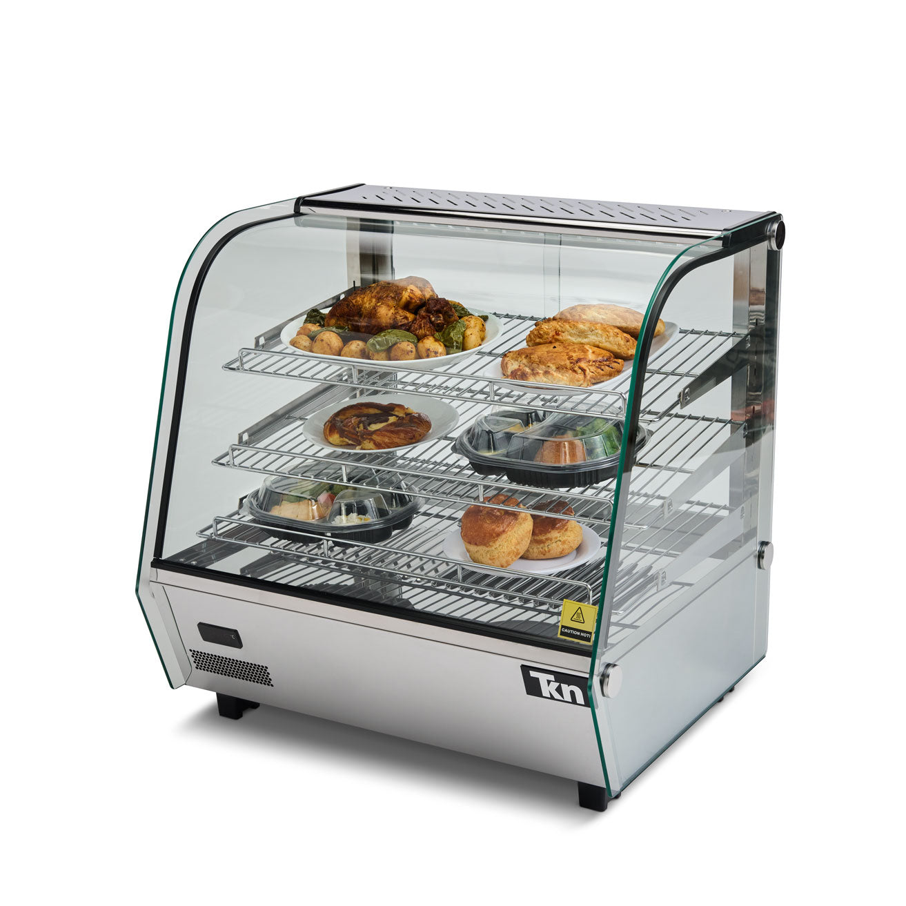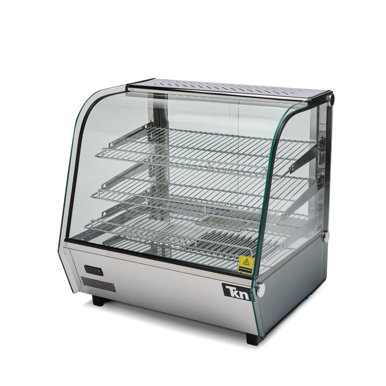 La vitrina caliente sobre mostrador TKN120H cuenta con control digital de temperatura y pantalla frontal. Incorpora vidrio curvo templado y cristales transparentes en los cuatro lados, que ofrecen visibilidad de 360°. Su diseño con puertas correderas traseras y su estructura en acero inoxidable, facilita la exhibición de distintos productos.