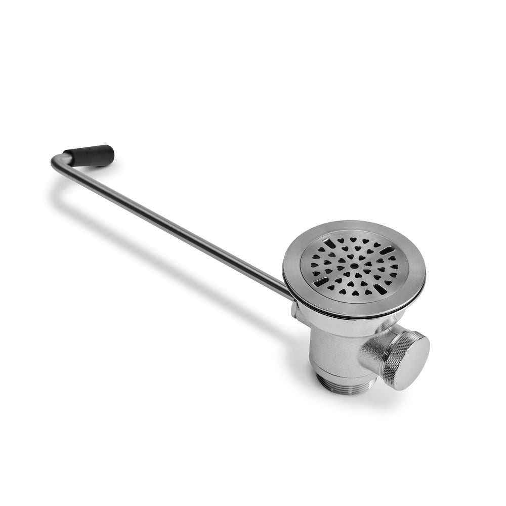 Válvula de drenaje rotatoria para orificio de fregadero de 3 1/2", con cuerpo de latón cromado rugoso, maneral giratorio con empuñadura de plástico resistente al calor, adaptador hembra de 2" NPT a macho de 1 1/2" NPT, colador removible de 3 1/2" de A. Inox. de encaje a presión y salida de desbordamiento con tapa.