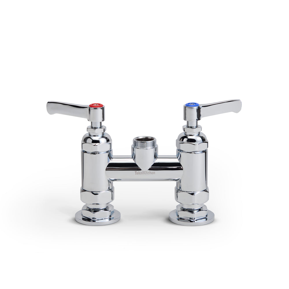 Llave mezcladora con montaje a cubierta de 4", con cuerpo de latón cromado pulido, sin cuello, cartuchos con válvula de retención, manerales tipo palanca y entradas G1/2".