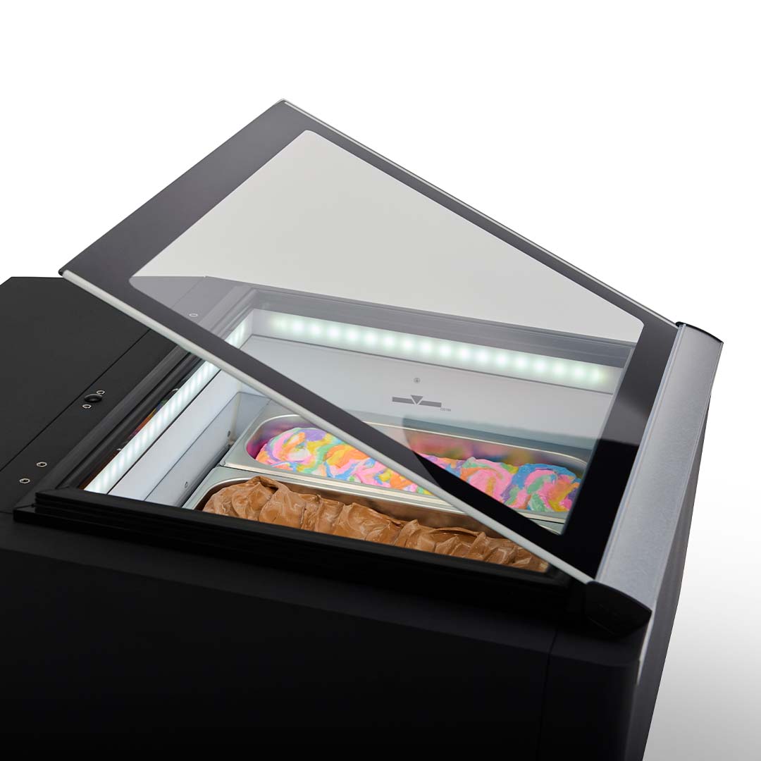 La vitrina de gelato modelo TKNS03B/W incorpora un compresor de alta eficiencia que garantiza enfriamiento rápido y estable, manteniendo la textura y el sabor del producto. Su aislamiento en espuma de ciclopentano asegura máxima retención de frío con menor consumo energético. Con diseño compacto, acabado mate y puerta de vidrio abatible, facilita tanto el servicio como la limpieza.