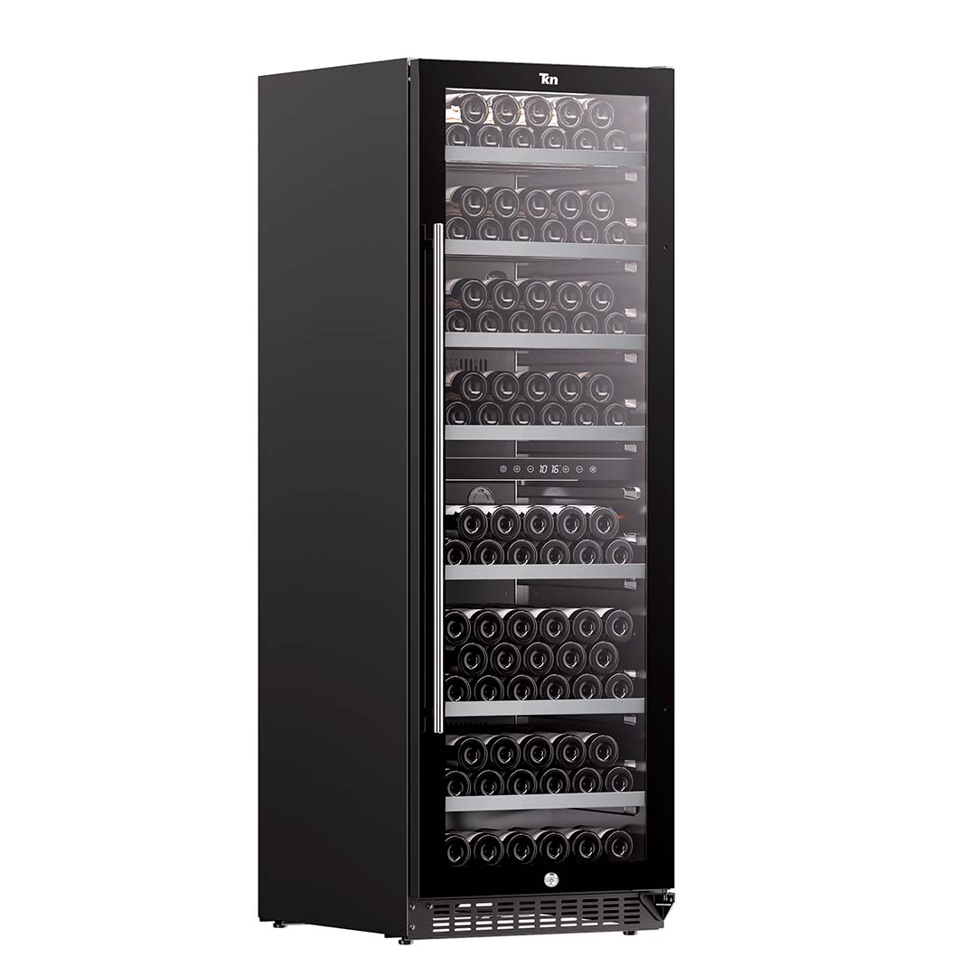 Cava de vino WC2T202 con capacidad de 202 botellas. Cuenta con doble zona de temperatura independiente, iluminación LED interior y control digital táctil. Equipada con 7 estantes de madera con marco metálico deslizantes y una puerta de vidrio con filtro UV